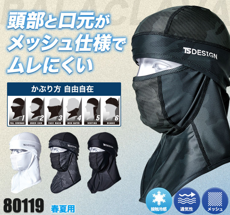 頭頂部と口元がメッシュ仕様になっており、ムレにくく高通気のバラクラバアイスマスク。かぶり方は6通りできるので、これ1枚あれば多様にお使いいただけます。ヘルメットインナーとしてもオススメです。