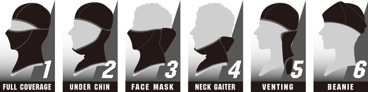 使い方は6通り!口元だけ外したり、首元だけ頭だけ着用したり、ヘルメットインナーとしても大活躍し、自由自在に使えるマスクです。