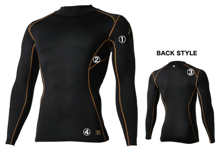 肩部分に補強パーツを使用したTSDESIGNのプロ仕様インナー。3つの素材を使用し保温性と通気性の良さに優れた快適なハイネックタイプのコンプレッション。