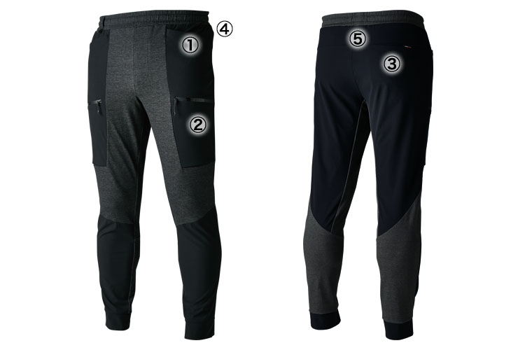 両サイドポケット、両サイド止水ファスナーのカーゴポケット、右後ろのポケットと計5つのポケットがあります。すっきりしたシルエットですが、収納力が抜群!カーゴポケットはファスナータイプなので、貴重品等の落下を防ぎます。