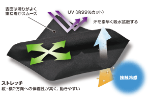 独自の接触冷感効果により、夏場もひんやり快適。 吸汗速乾で汗を素早く吸収拡散することにより、つねにドライな着心地をキープ。 縦・横の2方向への伸縮性があるため、ピッタリフィットだけど動きやすく 機動性も確保。 UVカット(約99%カット)で、屋外での作業も安心です。