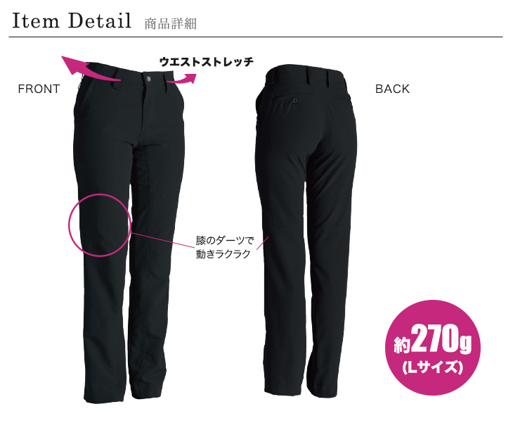 ストレッチ性に優れ、耐久性にも優れた藤和のレディースパンツ。撥水加工も施されているので、雨の日にも最適です。