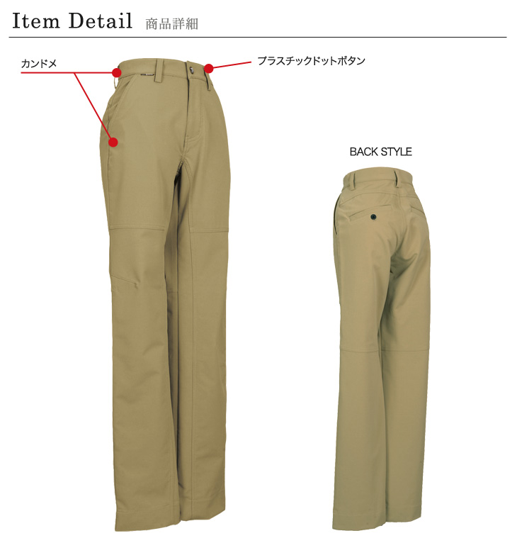 - 両脇ポケット、左右ヒップポケット、裏地なし