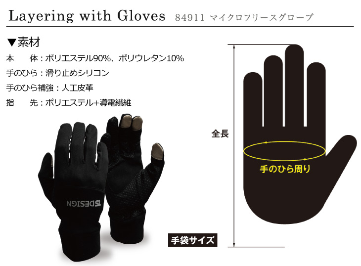 - 本体:ポリエステル90%・ポリウレタン10%、手のひら:滑り止めシリコン、手のひら補強:人工皮革、指先:ポリエステル+導電繊維