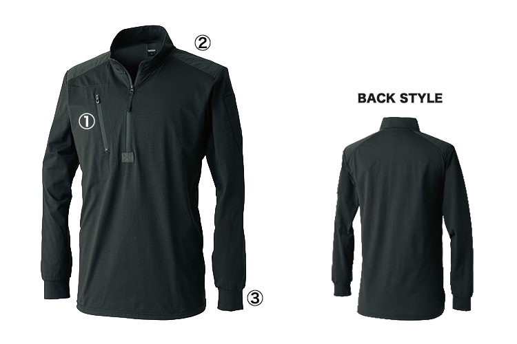 - 肩補強、左袖ペン差し、右胸ファスナーポケット、袖口リブ