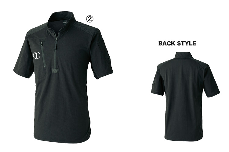 - 肩補強、左袖ペン差し、右胸ファスナーポケット