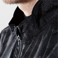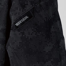遊び心のあるおしゃれなデザインのジャケット。光を当てると、迷彩柄のようなモザイク調のプリント部分が反射し光ります。