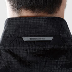 光を当てると、迷彩柄のようなモザイク調のプリント部分が反射し光ります。暗闇での安全性を確保します。