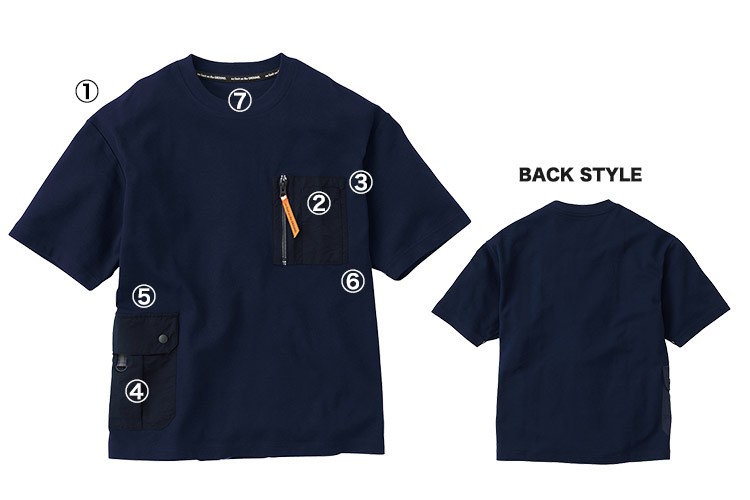 胸には通常のポケットとファスナー付きのW収納、右腰にはボタンで閉められるポケット付きと、とにかく大容量!Tシャツの枠を越えたワークTシャツです。