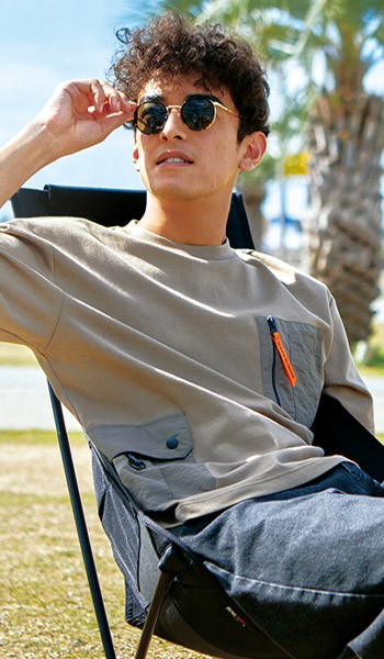 胸と右腰のファスナー・蓋付きポケットが大容量で便利!表は綿の柔らかな風合いがありつつ、裏はポリエステルでサラリとした着心地が続く、まさにいいとこ取りな多機能Tシャツ。