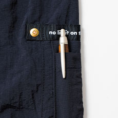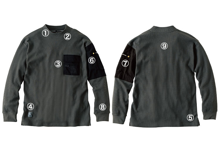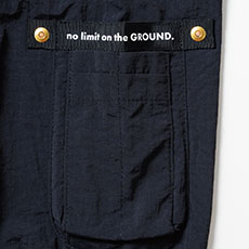 - 左胸フラップポケット、反射ロゴネーム、スリット裏ロゴテープ使い、左袖ペン差し、袖マルチポケット、袖口リブ、デオドラントテープ