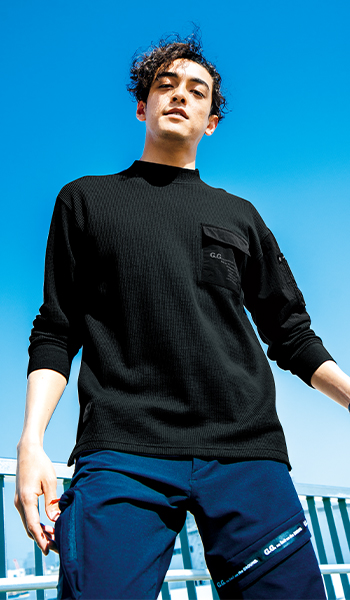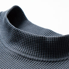 ざっくりした網目とオーバーサイズのゆったり感で、トレンド感のあるデザイン性が魅力のワッフルTシャツ。モックネック仕様とポケットの異素材使いがおしゃれで仕事でもプライベートでも着られる一着。