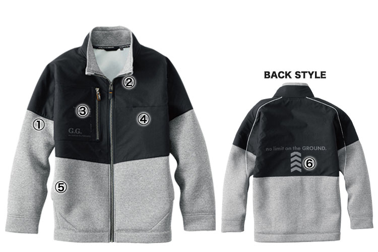 - 右胸ファスナーポケット、左胸ポケット、両脇ポケット、チンガード