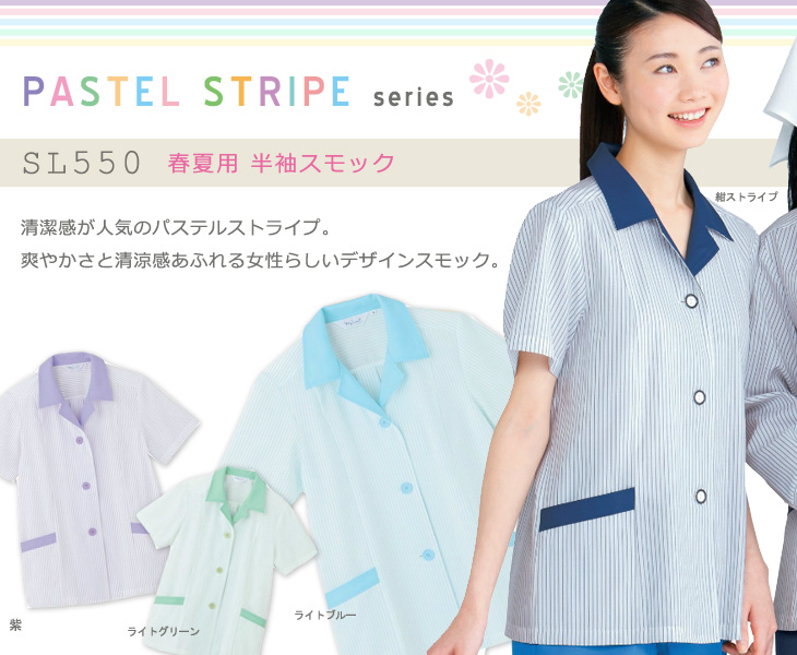 パステルストライプの女性らしいデザインの半袖スモック。爽やかさや清潔感あふれる風合いが人気です。