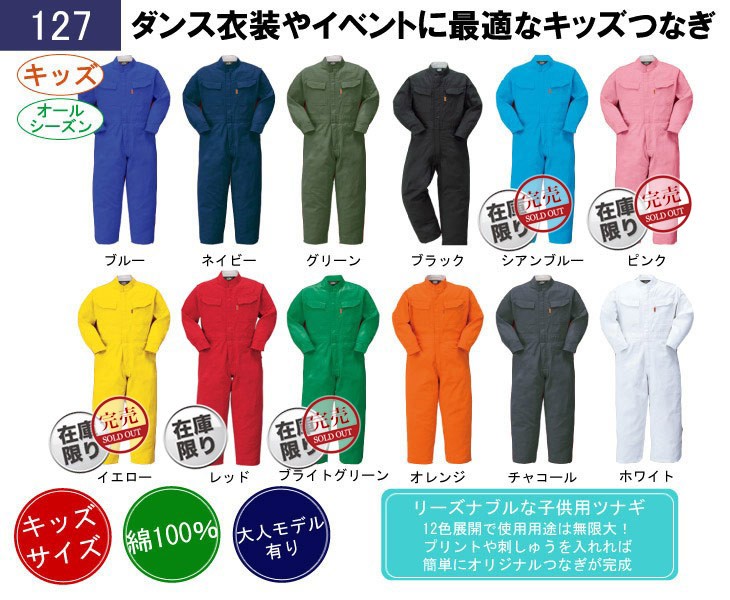 ヤマタカ、キッズ用のカラフルなつなぎです。イベントなどで揃えるのに最適!