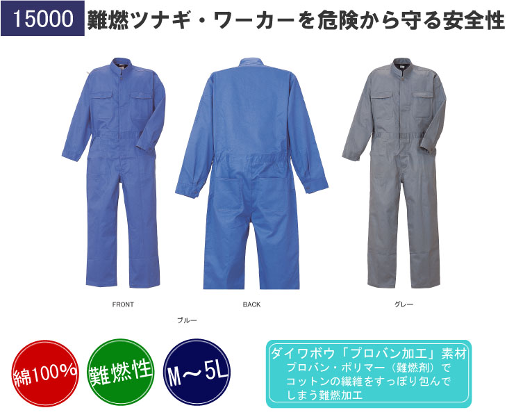ツヅキ服,続服,自動車整備,バイク,ツナギ,つなぎ,クレ被服,カツラギ,綿100%,難燃,燃えにくい,耐火性,ダイワボウ,プロバン加工,グレー,ブルー,5L,春秋冬用