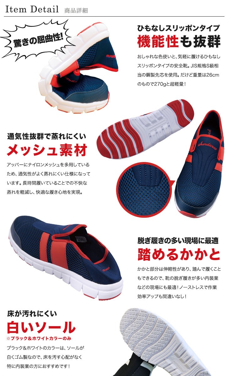 曲がりやすいソールと軽さで、歩きやすく疲れにくいサンダンス安全スニーカー。脱ぎ履き楽ちんでかかとが踏めるスリッポンタイプです。