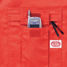 背面の肩部分と脚の部分に新たなカットを入れることで、 腕と脚の動きに対して生地が引きつることを軽減させた「ムービンカット」を採用! 作業中の動きにストレスがなくなり、作業効率をぐーんとアップ! 胸ポケットには携帯電話収納用のポケットを備えています。