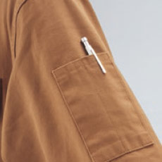 オーバーフラップを採用した左胸ポケット。ペンポケット付き