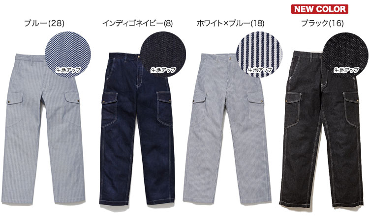 - インディゴネイビー、ブラック:ストレッチデニム(綿80%・ポリエステル20%)、ブルー: ストレッチヘリンボーン(綿59%・ポリエステル41%)、ホワイト×ブルー:ストレッチヒッコリー(綿59%・ポリエステル41%)