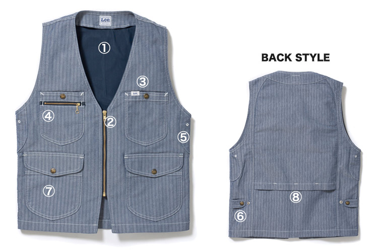 Lee独特のシェイプした形状のポケットが特徴的なジップアップベスト。 収容量の多い大きなポケットや、メッシュ裏地や菊穴等で通気性にこだわり、 伝統的なディテールと現代のニーズにあわせたベスト。