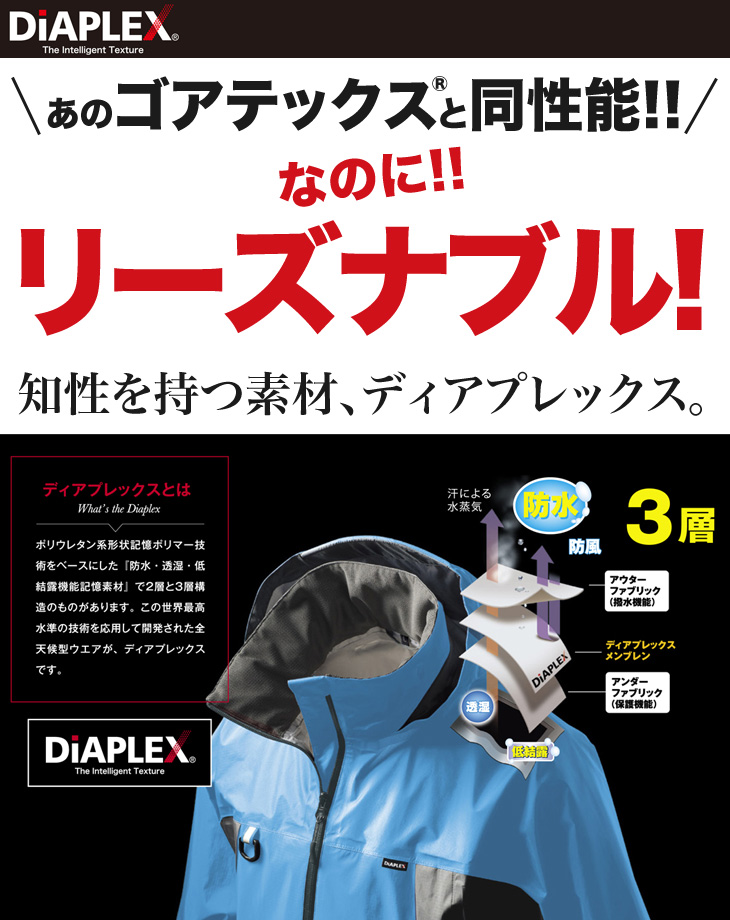 低結露機能素材を採用。モイスチャーバッファリング機能により水蒸気が水滴化する結露を防ぎ、衣服内を常にドライに保ちます。透湿性は16,000g/m2/24hrs以上!※透湿性とは24時間に何グラムの水分を外に出す能力があるかを表したもので、数値が高ければレインコートの内側は湿っぽくないということです。