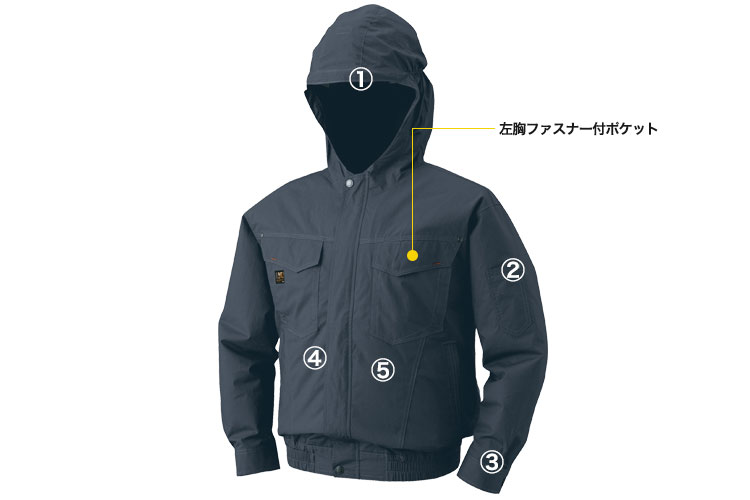 綿100%、フード付きの長袖空調服®。ヘルメット対応でフードにはヘルメット用の滑り止めも付いています。