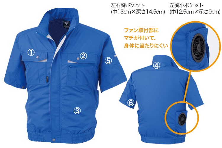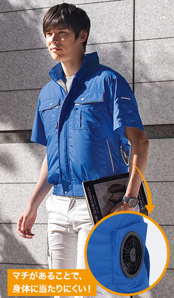 汚れとニオイを抑制する新素材の半袖空調服®。ファンの取り付け部分にマチを設けているのでファンが身体に当たりにくくなっています。