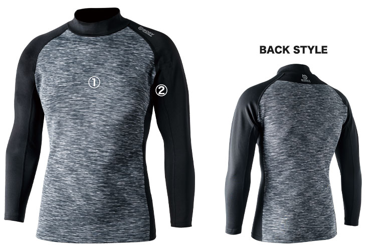 空気の層に裏起毛と遠赤加工をプラスした、トリプル保温。首、脇、腕の内側部分に伸縮性にすぐれた薄地の微細裏起毛ファブリックを使用。高い保温性能を保ちつつ、腕や胴体部分の圧迫感を解消し動きやすくしてくれます。