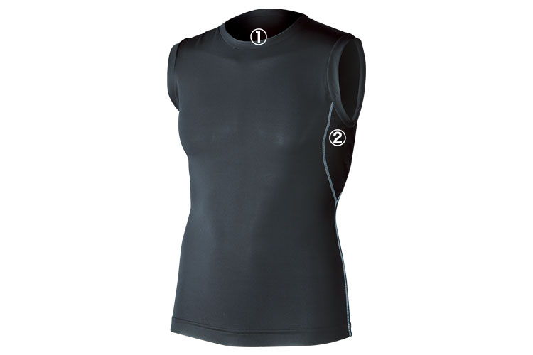 ニオイの気になる首まわりと脇部分に、消臭コアーミシン糸スイトールC®を使用しています。