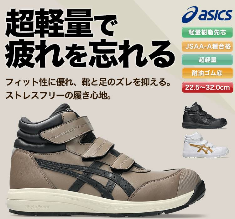 アシックスの軽量安全シューズ。シューズ全体の軽量化を追求した設計とハイカットベルトタイプで足にフィットし履き心地の良い仕様になっています。