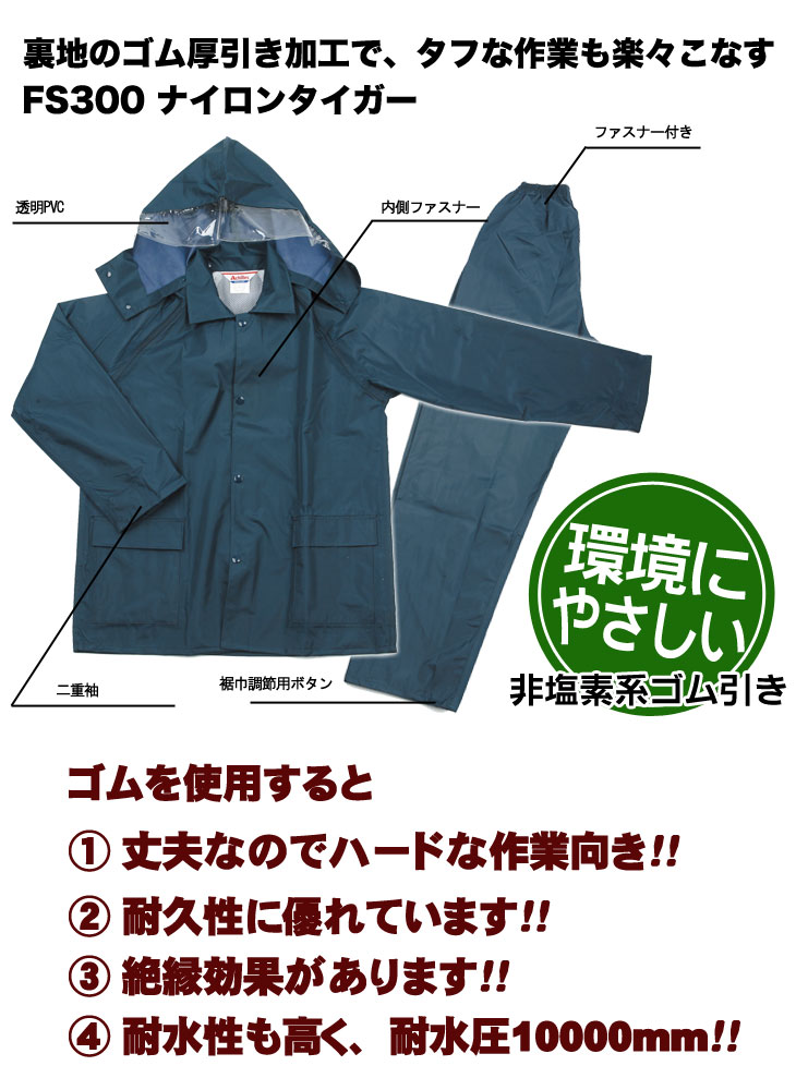 - 表:ポリエステルタフタディックガード 裏:シンセティックラバー厚引加工 機能:二重袖/裾調節ボタン/内側ファスナー/裏地ゴム厚引加工