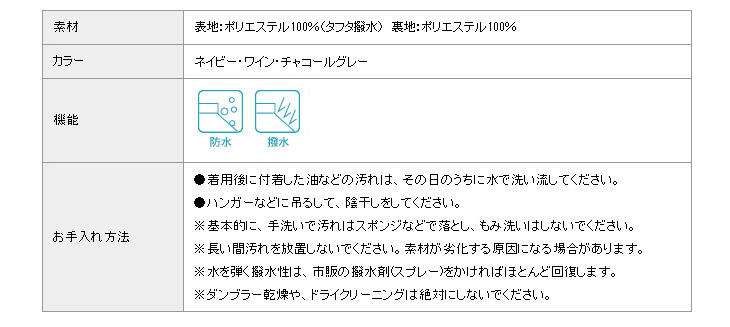 - 表地:ポリエステル100%(タフタ撥水) 裏地:ポリエステル100%