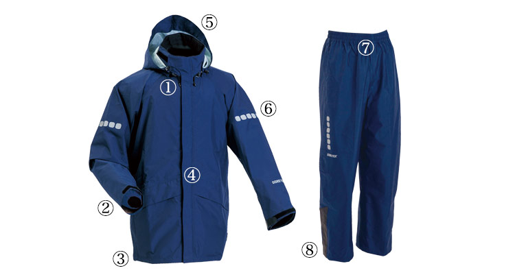 - 表地:ナイロン100%・ePTFEラミネート、裏地:ナイロントリコット/多機能(ヘルメット専用インナーフード採用/ドット式反射/二重袖/水抜き機能付シームレスヒップ)