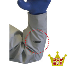 二重袖仕様でグローブ着用時、腕の上げ下げを繰り返す作業中でも、袖からの水の侵入を防ぐ事ができます。外袖には水抜きを付け内袖内の水を速やかに排出します。