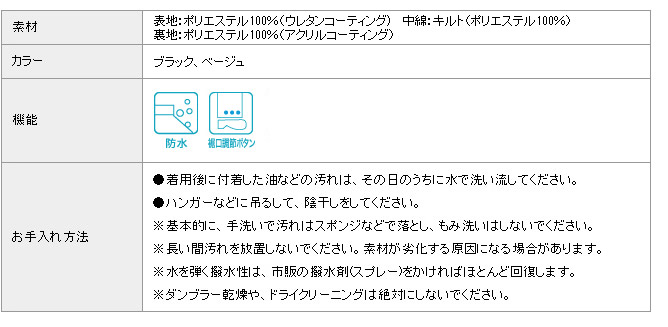 - 表地:ポリエステル100% ウレタンコーティング、中綿:キルト ポリエステル100%、裏地:ポリエステル100% アクリルコーティング