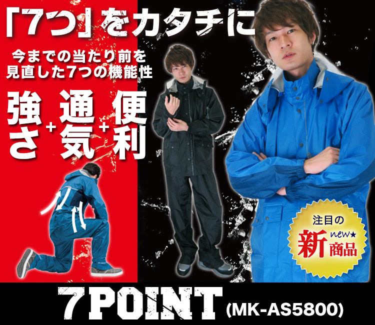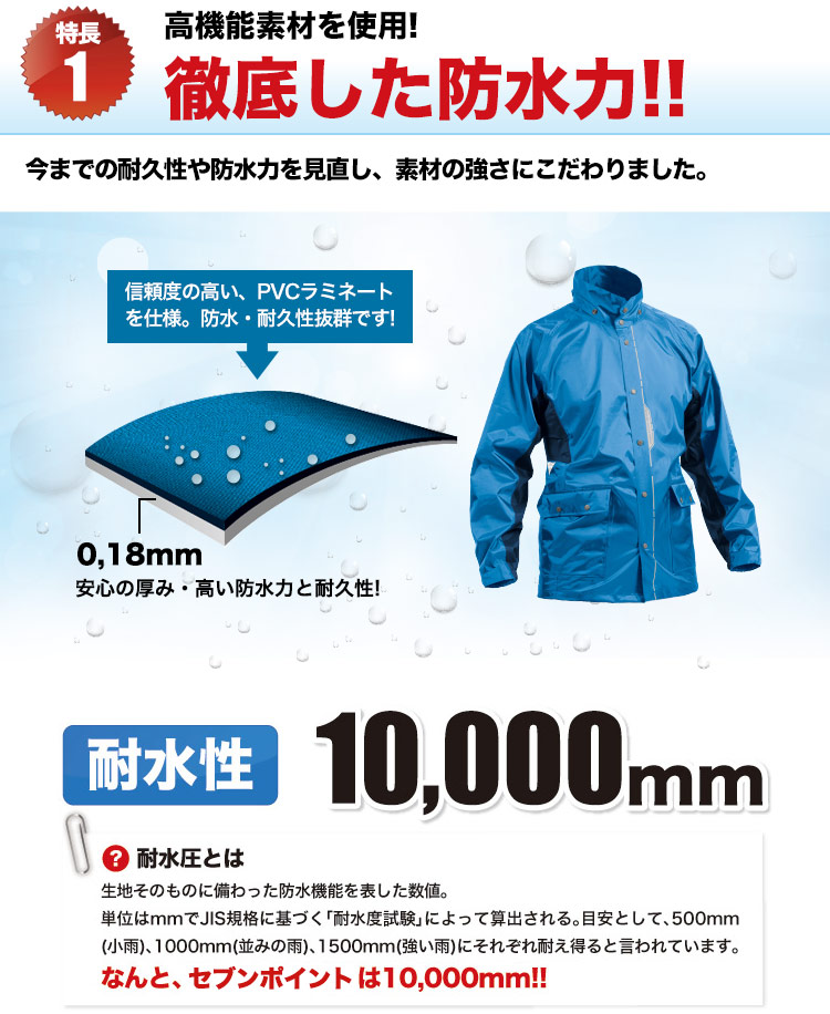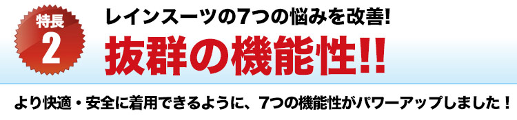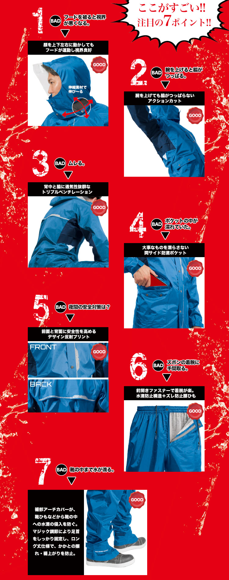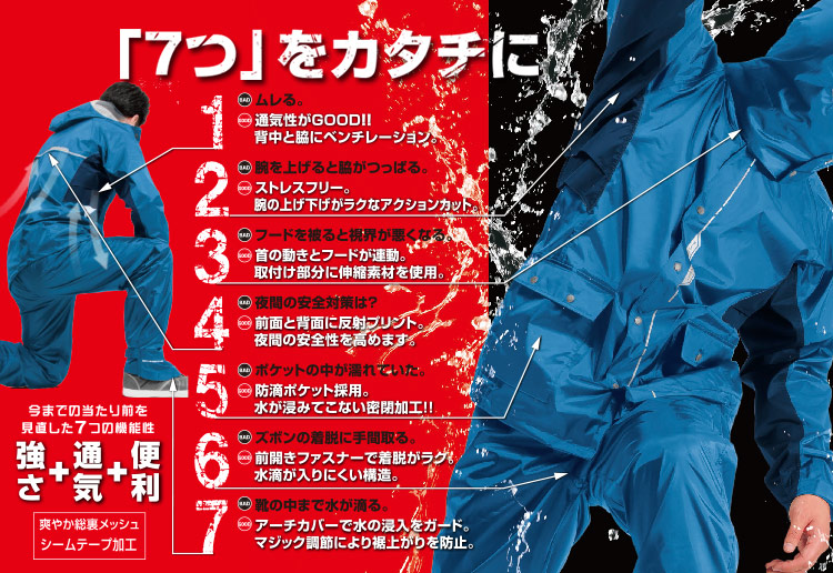 今までのあたりまえを見直した7つの機能性。徹底した防水力と抜群の機能性のレインスーツ。