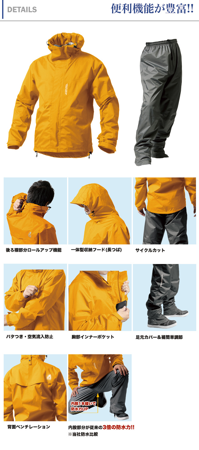機能性と防水性を徹底的に追求!カジュアルスタイルの作業用レインスーツ。